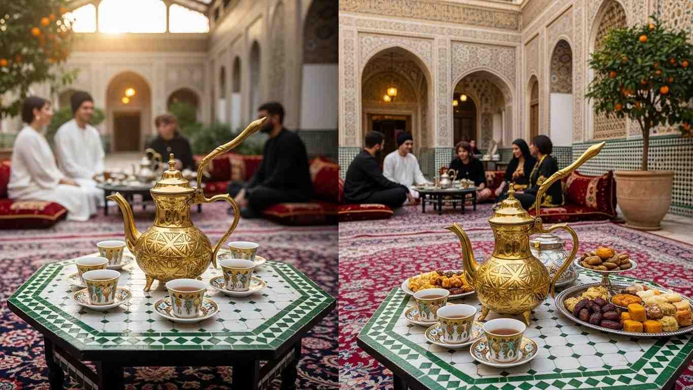 Подача марокканского чая сопровождается уникальным церемониалом, включающим многоэтапное заваривание и особый способ литья из чайника с большой высоты, что создаёт пену и насыщает ароматические свойства напитка. Чаепитие часто совмещается с беседой, музыкой и традиционными сладостями.