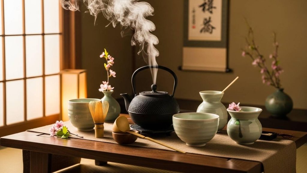 Традиционно чайная церемония проводится в специально отведённом помещении — чайном домике или комнате с минималистичным интерьером. Пространство должно быть чистым и тихим, чтобы создать атмосферу уединения и сосредоточенности.